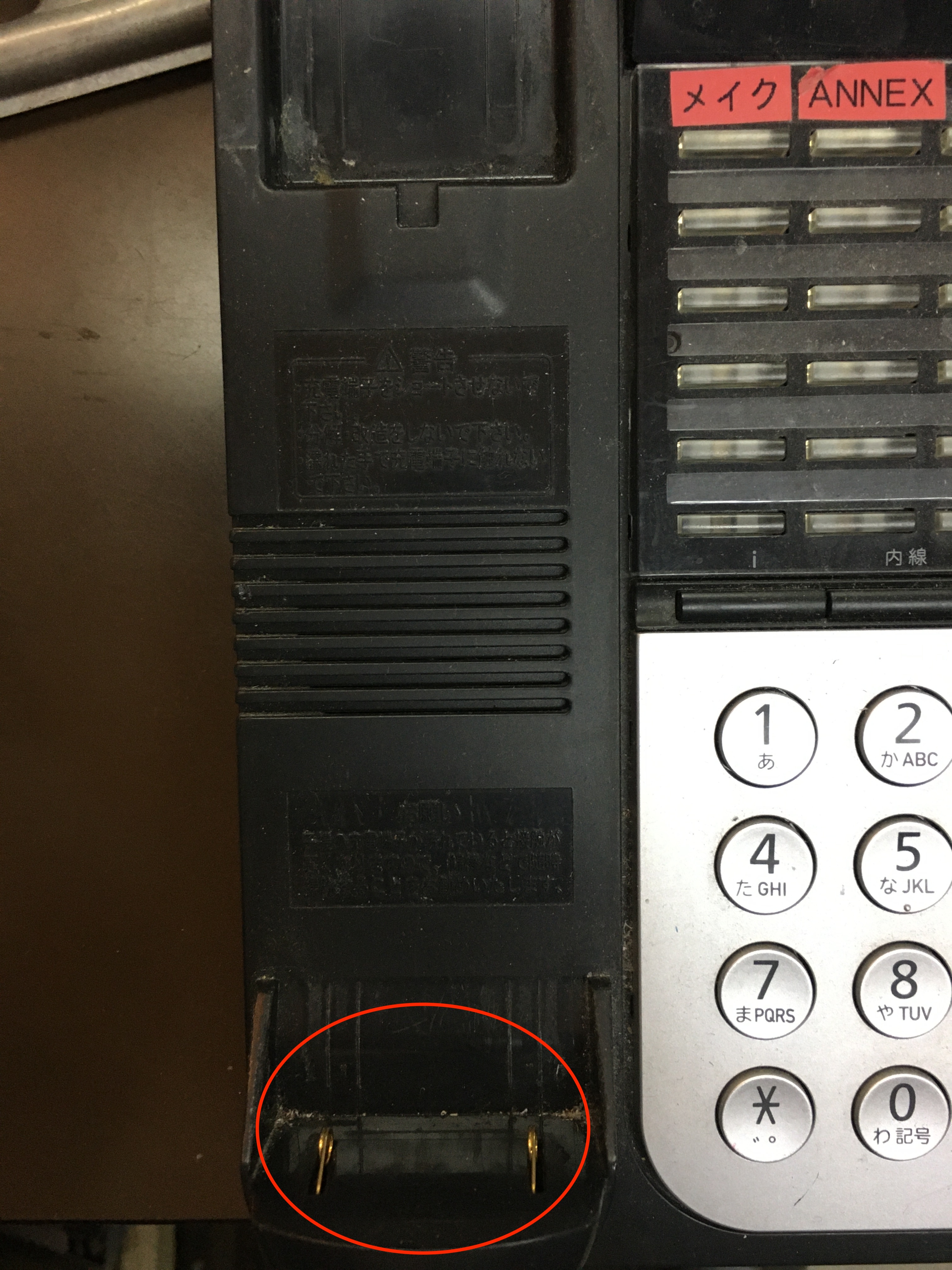 赤丸のコードレス電話機との接触する金属部分の清掃をしてみてはどうかと教えて頂きました。