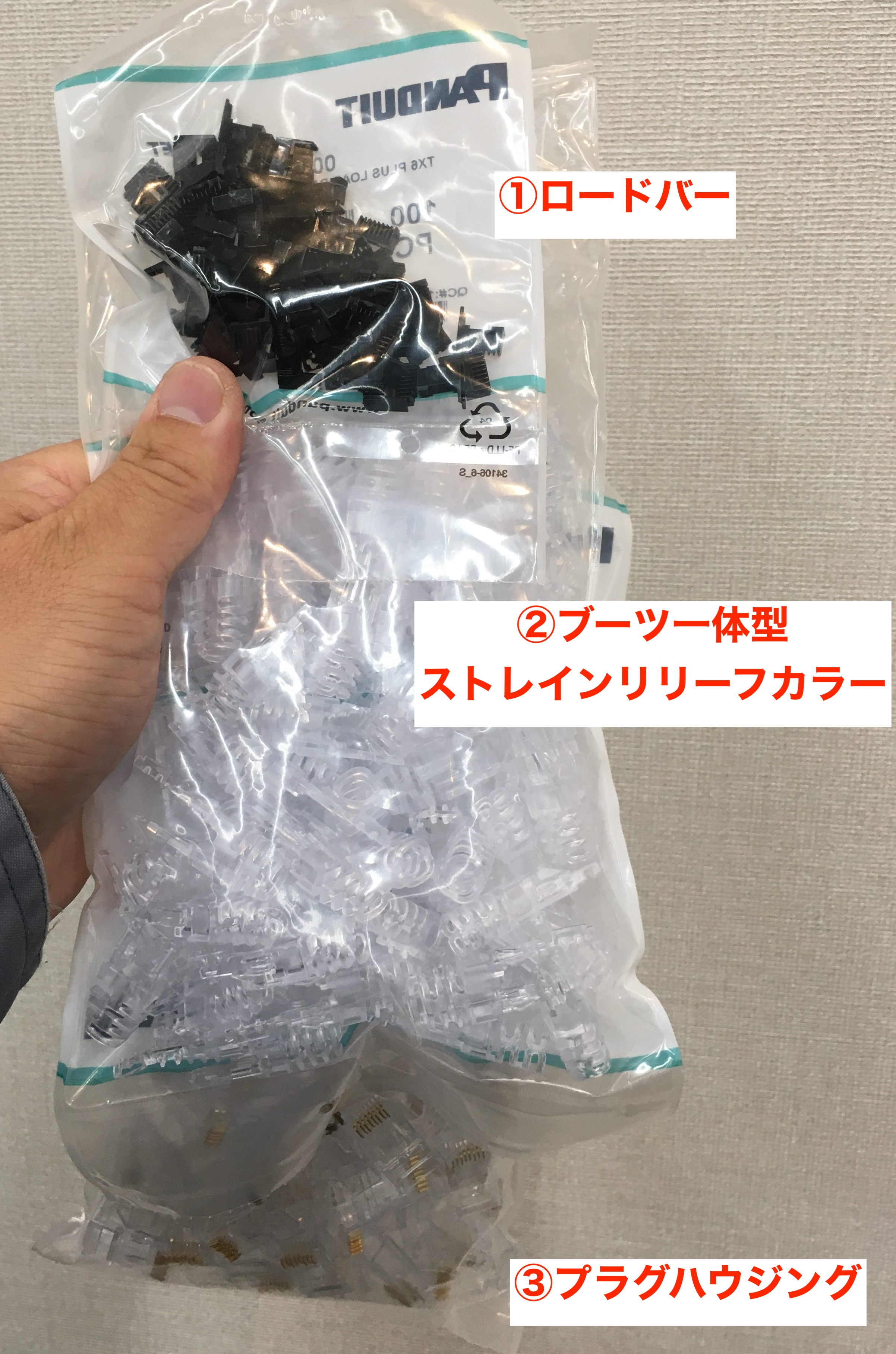 今回はPANDUITのブースでお話を伺いました。CAT6用の新しい端子「TX6PLUSモジュラープラグ」が登場しており、3つのパーツで生誕できる仕様に変更されたとのこと。